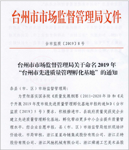 2019年8月19日,臺州市市場監(jiān)督管理局發(fā)布了臺市監(jiān)質[2019]8號文件關于命名2019年“臺州市先進質量管理孵化基地”的通知,我公司在2019年度臺州市級先進質量管理孵化基地申報項目申報工作中,經市場監(jiān)管局組織現(xiàn)場評價驗收,市局審核,同意命名為“臺州市先進質量管理孵化基地”。