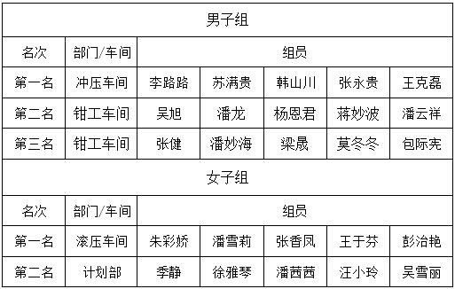 通過每次的消防演練及消防知識的培訓(xùn),不僅進(jìn)一步增強(qiáng)了廣大員工的防范意識和自救能力,了解和掌握如何識別危險(xiǎn)、如何采取必要的應(yīng)急措施等基本操作,以便在事故中達(dá)到快速、有序、及時(shí)、有效的效果。同時(shí)為了鼓勵(lì)廣大員工能更踴躍的融入到消防演練的集體中,在此次演練評選出男子組前三名、女子組前兩名,并頒發(fā)了獎狀及獎金,以資鼓勵(lì)。獲獎名單如下: