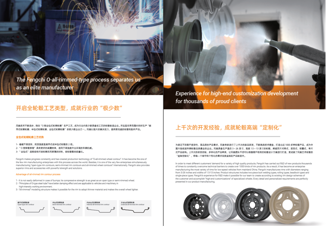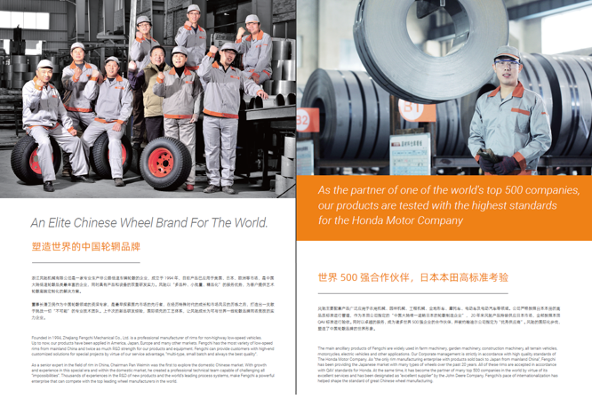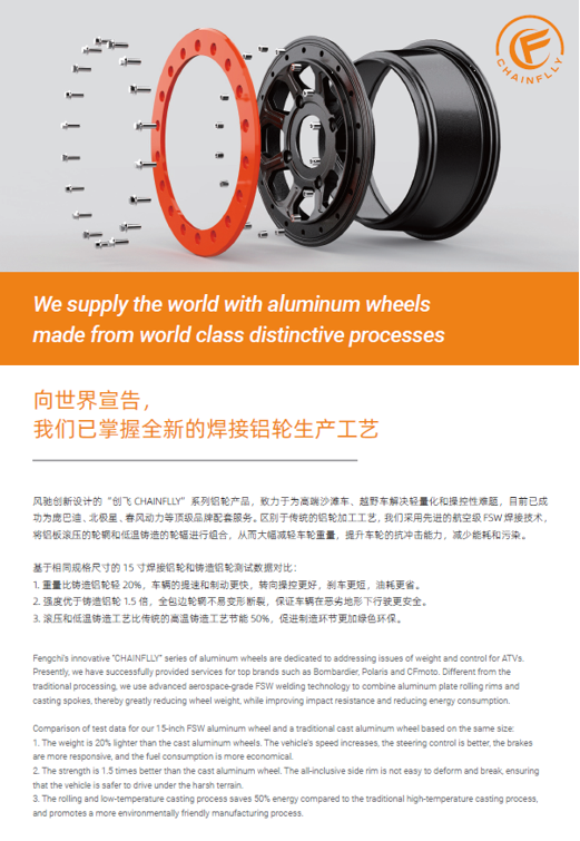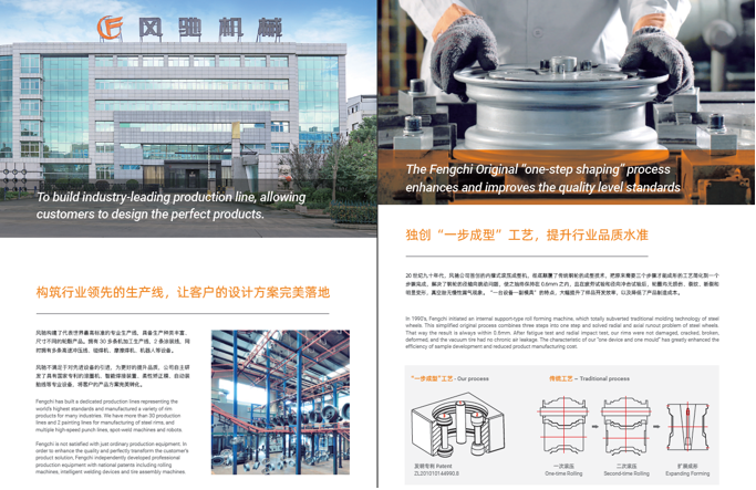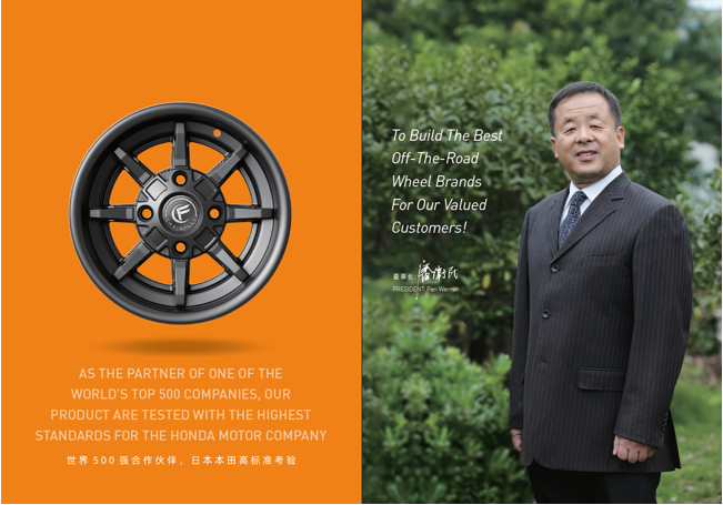 浙江風(fēng)馳機(jī)械有限公司,成立于1994年,伴隨著時(shí)間的飛逝,一直以工匠精神專注生產(chǎn)非公路低速車輛輪轂,在董事長潘衛(wèi)民的英明帶領(lǐng)下,風(fēng)馳以自信、沉穩(wěn)、堅(jiān)實(shí)的腳步,企業(yè)逐步成為了世界500強(qiáng)合作伙伴、申請(qǐng)了企業(yè)獨(dú)有的輪輞品牌、創(chuàng)立了旗下5家子公司、獨(dú)創(chuàng)特殊工藝、產(chǎn)品革新?lián)Q代,一直以實(shí)現(xiàn)“引領(lǐng)低速車輪發(fā)展,為中國制造正名”的使命及成為“全球知名低速車輛制造企業(yè)的最佳戰(zhàn)略合作伙伴”為愿景而一直努力著。