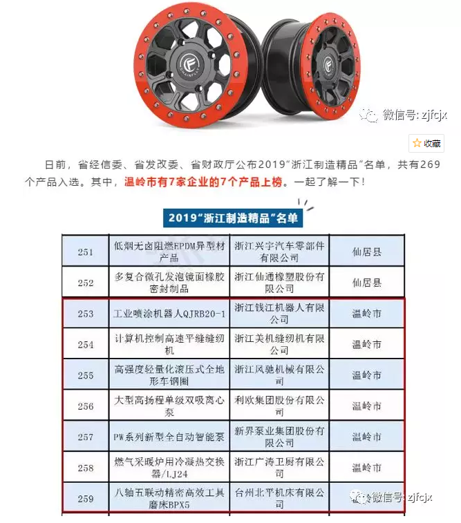 為全面提升“浙江制造”品牌形象,深入推進(jìn)實(shí)施“四換三名”工程,推動企業(yè)提升創(chuàng)新能力、品牌培育和市場開拓力度,扶持并推廣應(yīng)用一批“技術(shù)先進(jìn)、設(shè)計(jì)新穎、質(zhì)量可靠、效益優(yōu)良”的浙江制造產(chǎn)品,公司響應(yīng)風(fēng)馳于2019響應(yīng)政府號召積極參與“浙江制造精品”申報(bào),通過省經(jīng)信委、省發(fā)改委、省財(cái)經(jīng)廳聯(lián)合開展評選,風(fēng)馳的《高強(qiáng)度輕量化滾壓式全地形車鋼圈》上榜入選為2019“浙江制造精品”名單,同時根據(jù)市政府鼓勵企業(yè)開發(fā)新產(chǎn)品的規(guī)定,公司將予以獲得30萬元的獎勵。