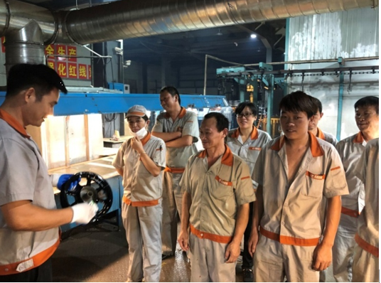 2019年9月17日,針對(duì)前期本田客戶反饋特黑GJBA軸套與制動(dòng)轂周邊出現(xiàn)白色異物的情況,生產(chǎn)部特組織對(duì)GJBA擦修工序員工展開(kāi)擦銹技能培訓(xùn),此次培訓(xùn)由涂裝車間主任朱新華主講,分別結(jié)合實(shí)際案例、作業(yè)指導(dǎo)書、現(xiàn)場(chǎng)操作等形式展開(kāi)培訓(xùn),以求達(dá)到更好培訓(xùn)效果。